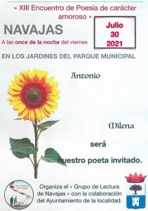 Para el próximo fin de semana tenemos nuevamente varias citas que destacar. Por un lado, el Grupo de Lectura, en colaboración con el Ayuntamiento de Navajas, organiza el XIII Encuentro de Poesía de carácter amoroso. Será el próximo viernes 30 de julio a las 23 horas en los jardines del Parque Municipal. Contará como artista invitado para la ocasión con el poeta Antonio Carvajal Milena. El grupo de lectura invita a todos a unirse a este acto. La entrada será libre hasta completar aforo.