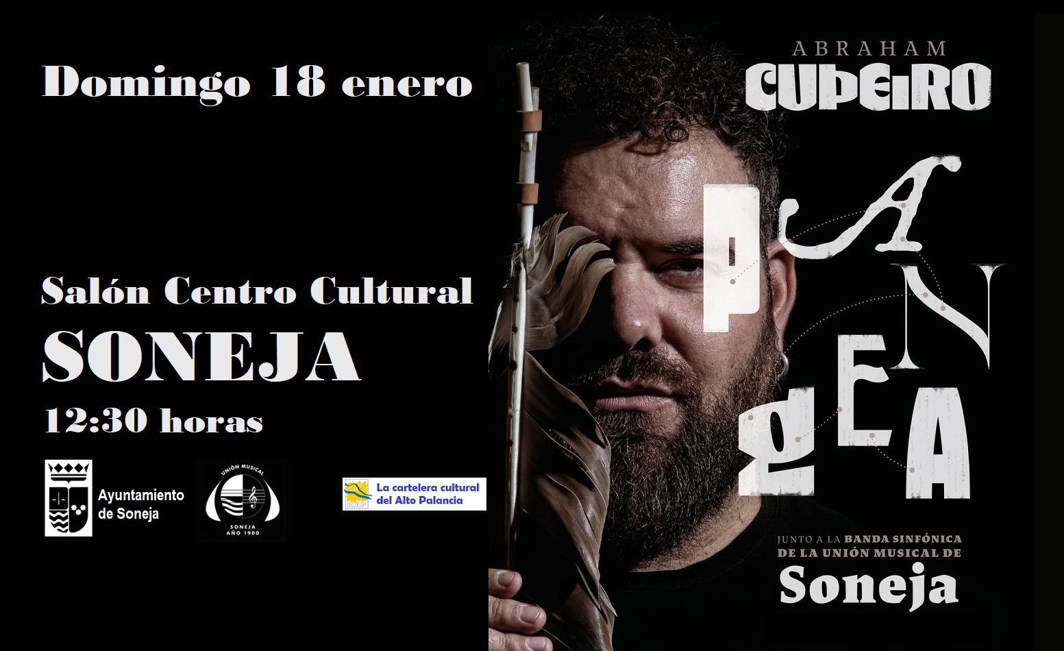 El próximo domingo 18 de enero, a las 12:30 horas, en el Salón del Centro de Cultural de Soneja, Abraham Cupeiro ofrecerá el concierto Pangea, junto a la Banda de Música de la Sociedad Musical de Soneja.