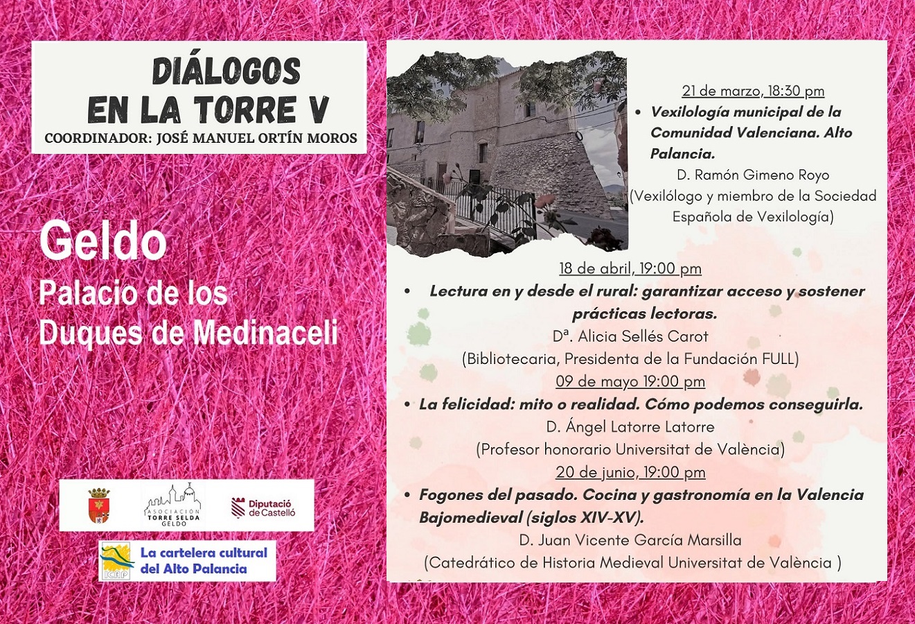 Entre los meses de marzo y junio del año 2026, la Asociación Cultural Torre Selda de Geldo ha organizado la quinta edición del Ciclo de Conferencias «Diálogos en la Torre», que se desarrollarán en el Palacio de los Duques de Medinaceli de Geldo. Las conferencias cuentan con la inestimable colaboración del Ayuntamiento de Geldo y la Diputació de Castelló.