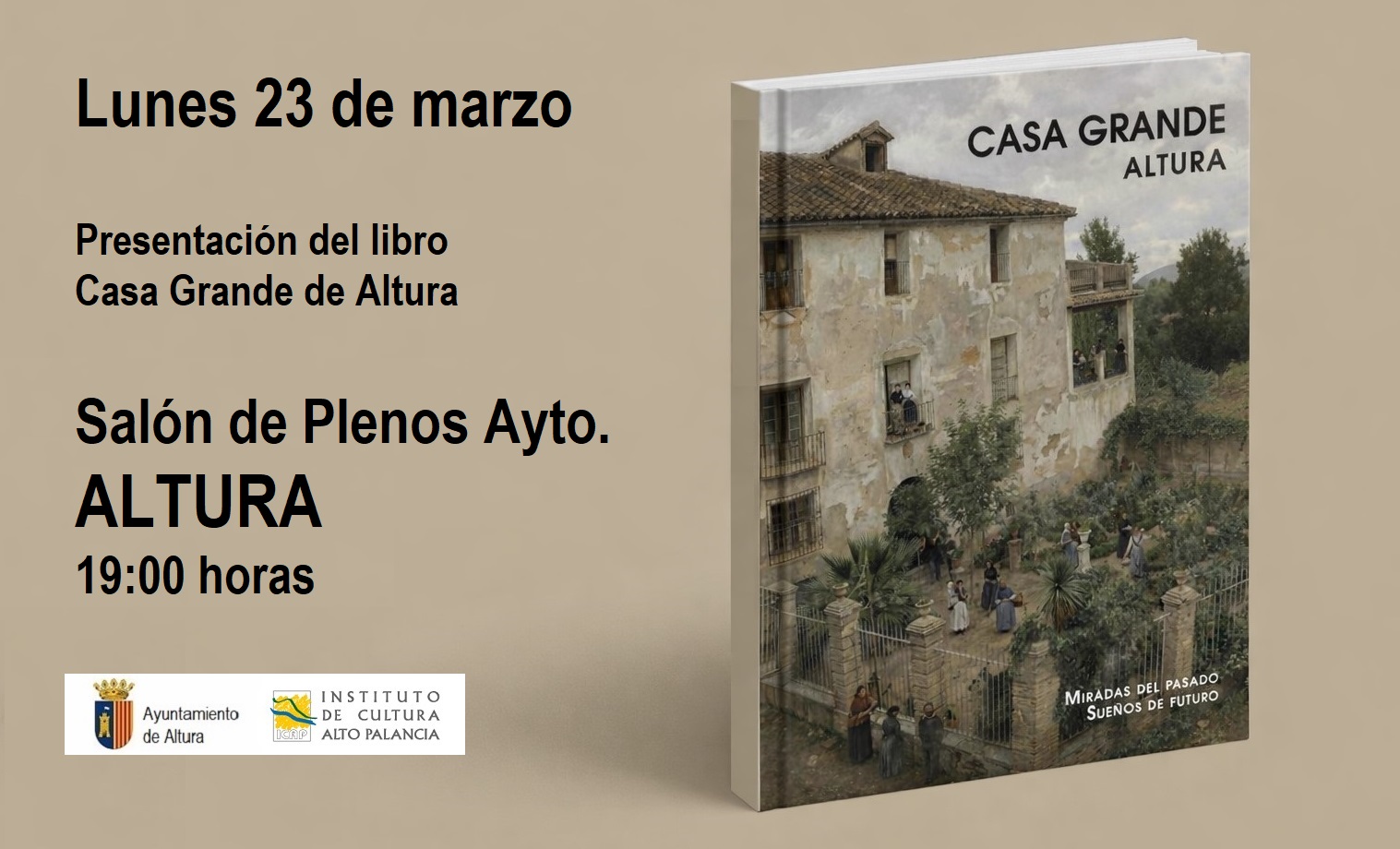 El próximo lunes 23 de marzo, a las 19:00 horas, en el Salón de Plenos del Ayuntamiento de Altura se presentará el libro “Casa Grande, Altura. Miradas del pasado, sueños del futuro”. La obra de investigación ha sido coeditada por el Instituto de Cultura Alto Palancia (ICAP) y el Ayuntamiento de Altura.