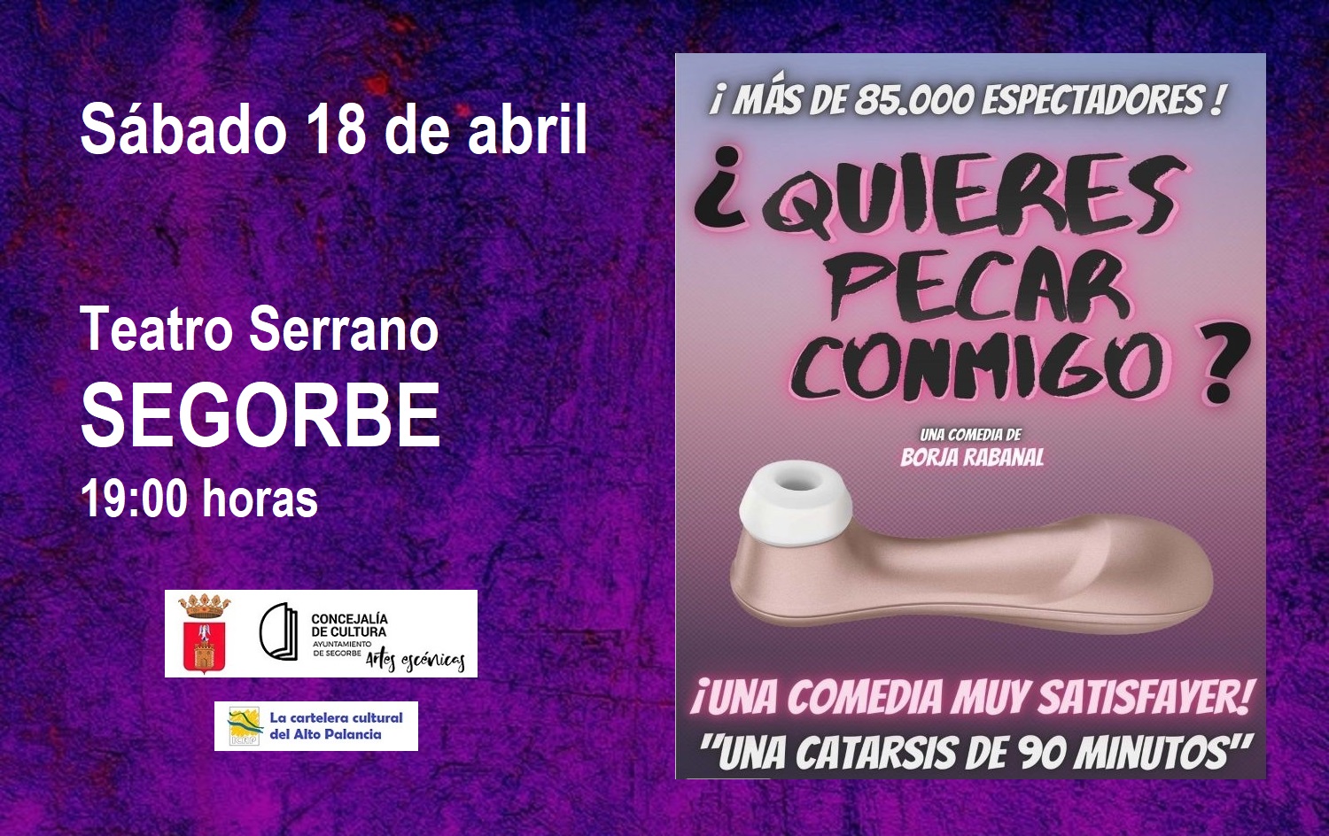 El próximo sábado 18 de abril, a las 19:00 horas, en el Teatro Serrano de Segorbe se representará la obra de teatro  “¿Quieres pecar conmigo?”. Las entradas a la venta en el Museo de Arqueología y Etnología de Segorbe (MAES) y Online en entradas.segorbe.es