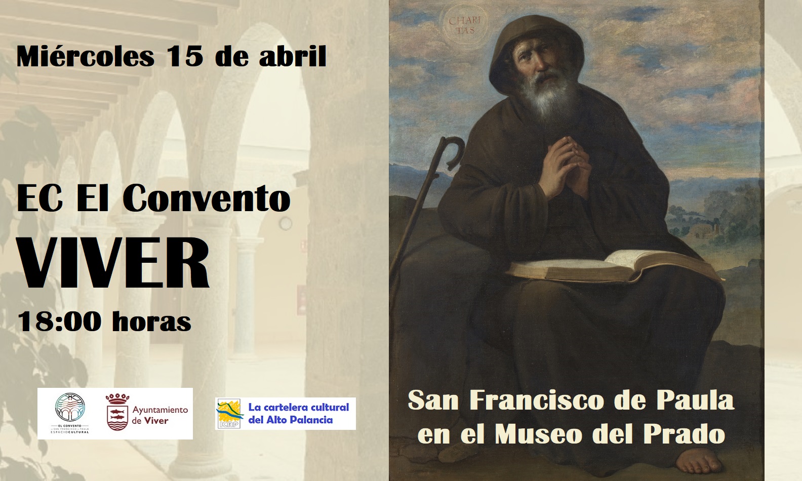 El próximo miércoles 15 de abril, a las 18:00 horas, en el Espacio Cultural El Convento de Viver se inaugurará la exposición “San Francisco de Paula en el Museo del Prado”. La muestra expositiva se podrá visitar del 15 de abril al 9 de mayo.