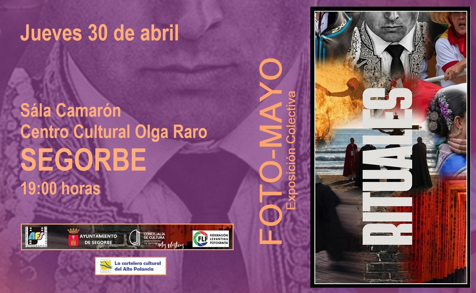 El próximo jueves 30 de abril, a las 19:00 horas, en la Sala Camarón del Centro Cultural Ola Raro de Segorbe se inaugurará la exposición fotográfica “Rituales”, de la Agrupación Fotográfica de Segorbe. La exposición podrá visitarse hasta el 31 de mayo con el siguiente horario: viernes y sábados de 18:00 a 20:00 horas, domingos de 12:00 a 14:00 horas.