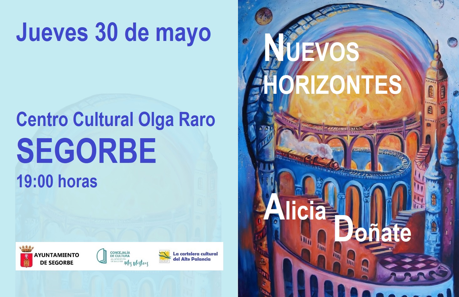 El próximo jueves 30 de abril, a las 19:00 horas, en el Centro Cultural Olga Raro de Segorbe se inaugurará la exposición pictórica “Nuevos Horizontes”, de la artista Alicia Doñate. La exposición se podrá visitar hasta el 31 de mayo en horario de viernes y sábados de 18:00 a 20:00 horas y los domingos de 12:00 a 14:00 horas.